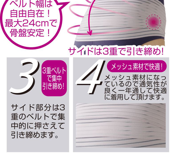 3重のベルトが、体型やボディラインに合わせて調節できるので、骨盤にぴったりとフィットします。